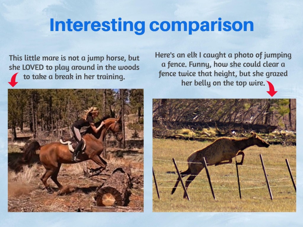 A beautifully balanced jump supporting a rider’s weight, being safely guided to avoid injury, wasn’t a concern for the elk. Their only thought was getting from point A to point B, in a hurry, to evade a predator’s presence. Survival training, and instinct, is all that’s necessary for the elk in the wilderness.