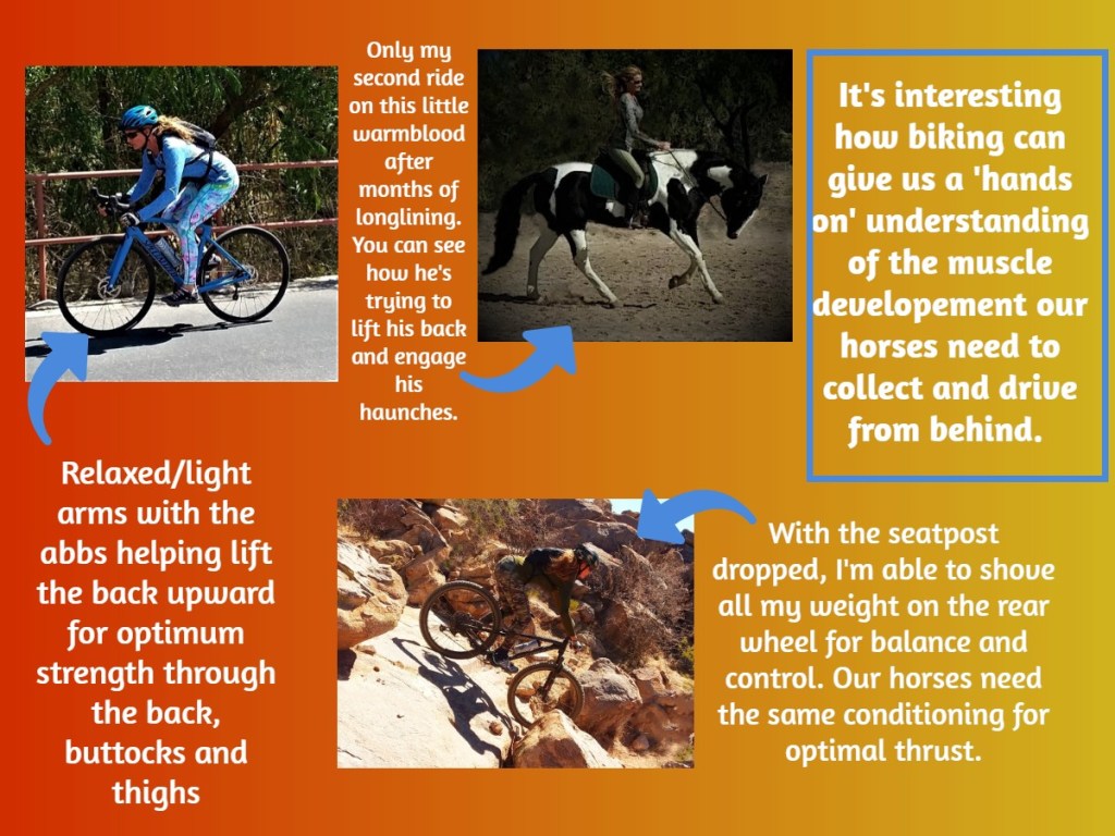 You might be thinking, “How strange.” I know, it is, actually. But I have learned, over the years, how the sport of road and mountain biking can help the equestrian rider understand the simple mechanics of how our horses need to use their muscles. In addition, becoming an experienced cyclist causes we, as riders, to evolve with a ‘hands on’ feel for what our horses need to succeed and be comfortable.